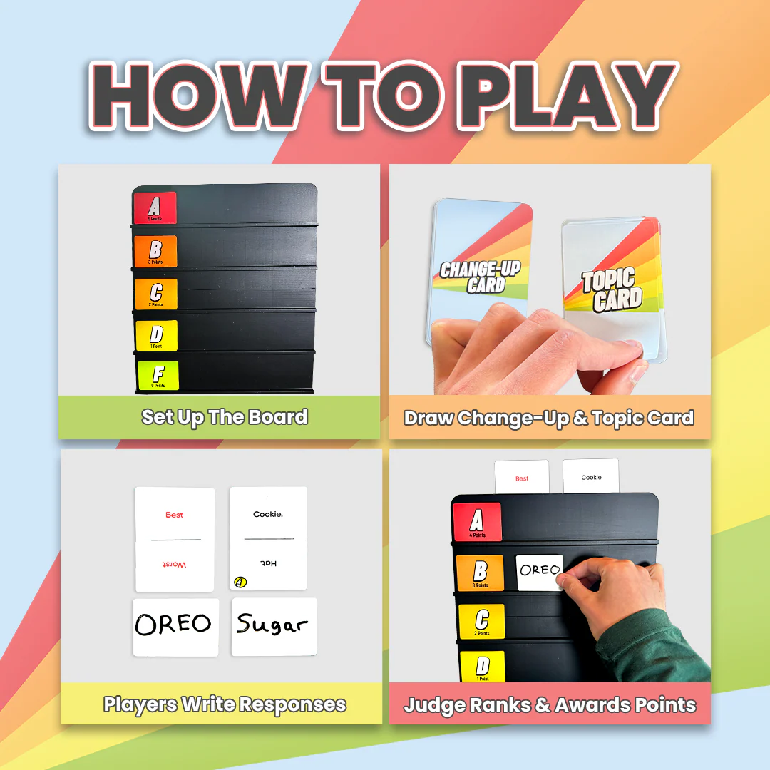 🔥 THRILLING TIER LIST CHALLENGE: Each round, a new judge picks a category. Players then write on their cards their submissions that fit best within this category. The higher the judge ranks your card, the more points you get!
